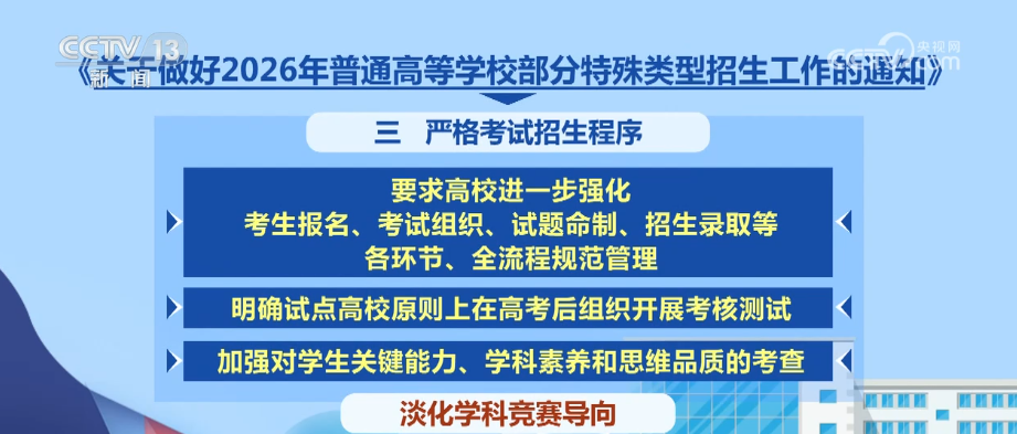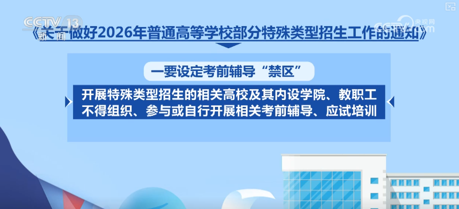 對于2026年普通高校部分特殊類型招生工作,《通知》要求,各地各有關(guān)高校建立有效監(jiān)督機(jī)制,暢通社會監(jiān)督渠道,及時公開公示有關(guān)信息,主動接受監(jiān)督。未按要求公示的考生一律不得錄取,牢牢守住公平公正底線。