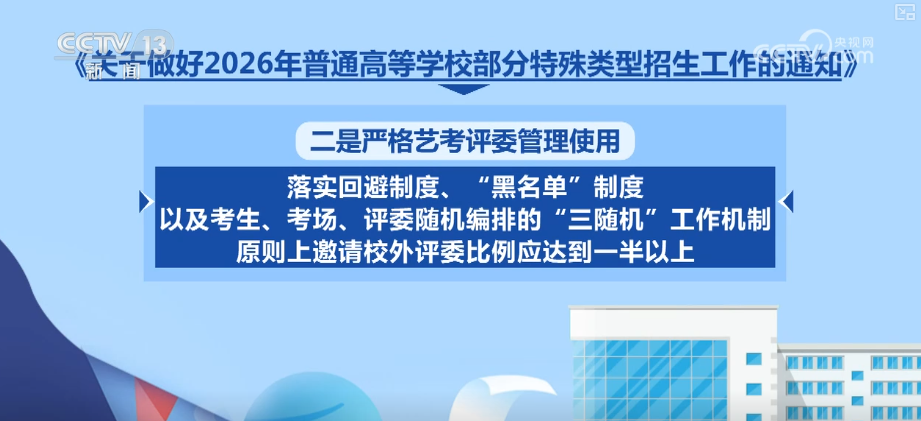 《通知》明確,一要設(shè)定考前輔導(dǎo)“禁區(qū)”,開展特殊類型招生的相關(guān)高校及其內(nèi)設(shè)學(xué)院、教職工不得組織、參與或自行開展相關(guān)考前輔導(dǎo)、應(yīng)試培訓(xùn)。二是嚴(yán)格藝考評委管理使用,落實(shí)回避制度、“黑名單”制度,以及考生、考場、評委隨機(jī)編排的“三隨機(jī)”工作機(jī)制,原則上邀請校外評委比例應(yīng)達(dá)到一半以上。三是建立藝考評委專家?guī)?,一旦發(fā)現(xiàn)評委存在可能影響考試招生公平公正行為,堅決嚴(yán)肅查處并納入“黑名單”。
