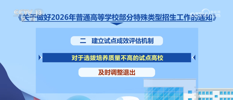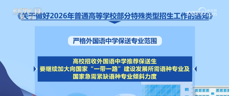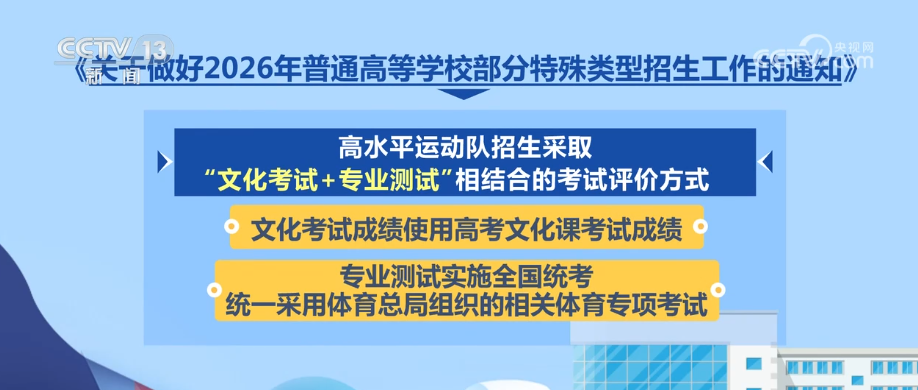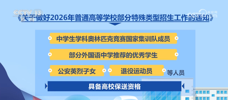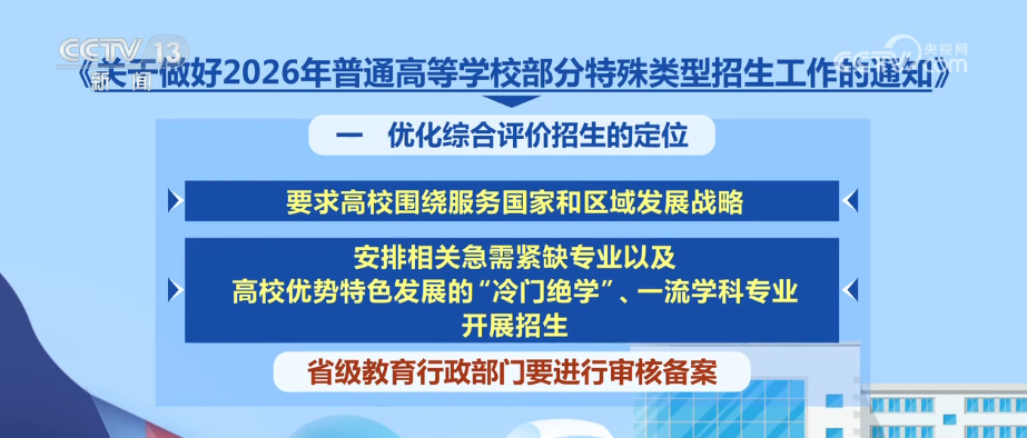 央視網(wǎng)消息:日前,教育部印發(fā)《通知》,部署做好2026年普通高校部分特殊類型招生工作。普通高校特殊類型招生主要包括藝術(shù)類專業(yè)招生、高水平運(yùn)動隊招生、保送生、綜合評價招生4類。
